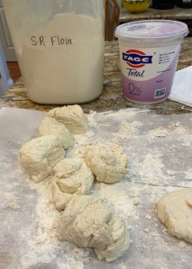 Mix the 2 3/4 cups flour with the yogurt in a bowl.. Turn out on a pastry board/sheet or on a piece of parchment paper. Knead briefly – using the 1/4 cup flour you set aside to add, as needed, to get it to a smooth ball. Cut into 16 equal pieces. I used a pastry cutter to cut the dough ball in half – then cut each half in half, etc.